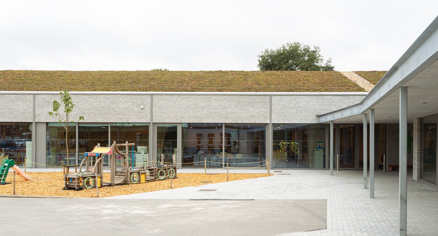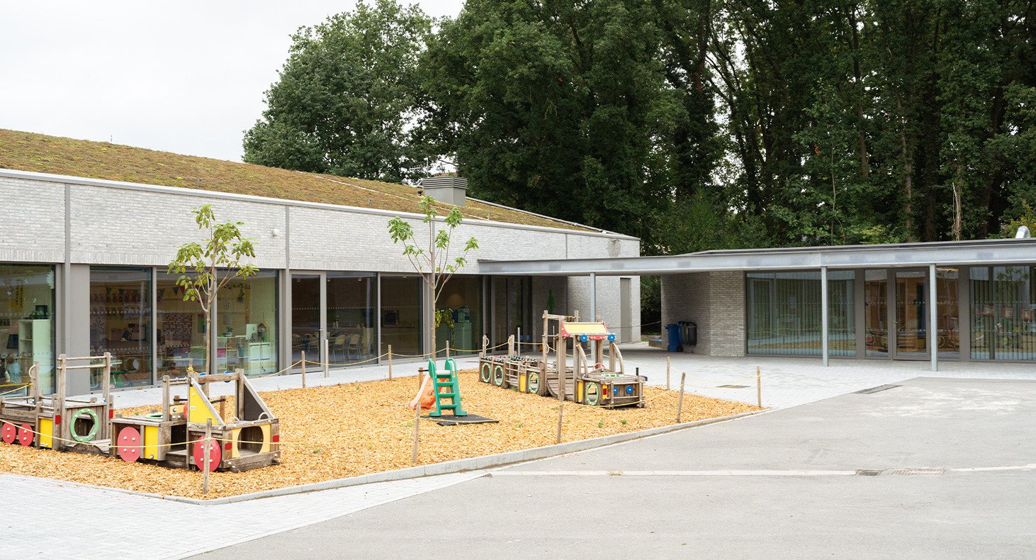 De realisatie omvat de afbraak van het verouderde schoolgebouw en de constructie van een moderne kleuterschool met verbeterde infrastructuur. In het nieuwe gebouw zijn acht kleuterklassen voorzien, een turnzaal, een secretariaat en een directielokaal. Daarnaast werd er ook een yogaruimte ingericht, die dienst doet als snoezelruimte. Dit biedt kinderen de mogelijkheid om zich niet alleen fysiek, maar ook op taalgebied verder te ontwikkelen. Bovendien krijgt elke klas een groene uitloop die rechtstreeks verbonden is met de speelplaats. Met deze modernisering streeft de school naar een aangenamere en efficiëntere leeromgeving voor zowel de leerlingen als het personeel. De extra ruimte en faciliteiten zullen bijdragen aan een verbeterd welzijn en een optimale ontwikkeling van de kinderen.
