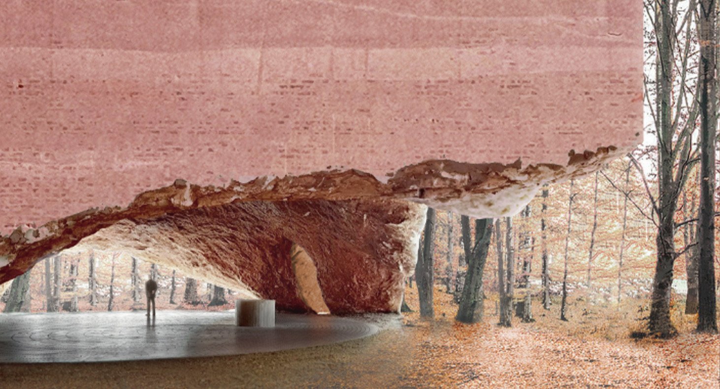 Bij de ingang verwelkomt een ronde ruimte met een grotachtig gevoel bezoekers en leidt hen naar de verschillende binnenruimtes van de kerk.