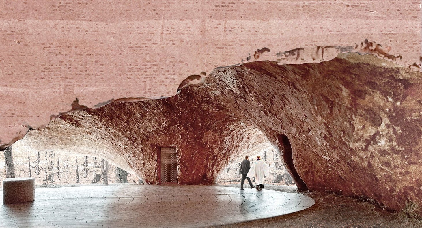 Bij de ingang verwelkomt een ronde ruimte met een grotachtig gevoel bezoekers en leidt hen naar de verschillende binnenruimtes van de kerk.
